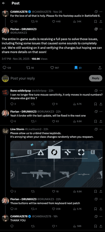 Wer aktuell in Battlefield 6 nichts hört, seine Maus nicht einstellen kann oder ständig mit der falschen Klasse spawnt, ist nicht allein. In einer Reihe von Antworten auf X hat Florian "DRUNKKZ3" Le Bihan bestätigt, dass diese Probleme bekannt sind und Lösungen bereitstehen.