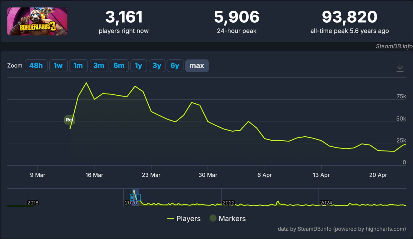 - Kein Live-Service: Borderlands 4 ist primär ein story-basiertes Koop-Spiel, dessen Spielerzahlen nach Abschluss der Kampagne naturgemäss sinken.
