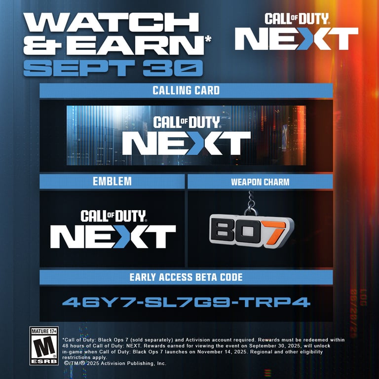 Die einzige Möglichkeit, kostenlos und ohne Vorbedingung am Early Access teilzunehmen, führt über das »Call of Duty: Next«-Showcase. Bei diesem Livestream werden am 30. September 2025 ab 18:00 Uhr deutscher Zeit neue Details zum Multiplayer enthüllt. Durch Zuschauen auf Twitch kannst du dir via Drops einen Beta-Key sichern.