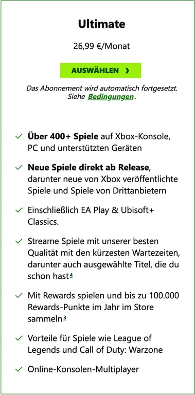 Game Pass Ultimate | 0 € (im Abo) | 323,88 € (12 x 26,99 €) | Zugriff auf hunderte Spiele. |