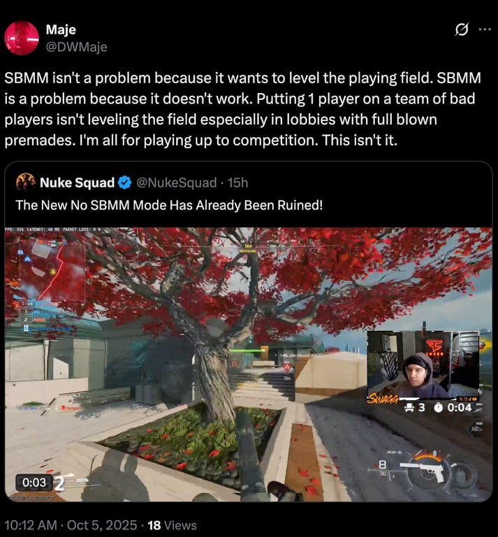 Gleichzeitig gibt es jedoch bereits erste kritische Stimmen, die aufzeigen, dass eine simple Reduzierung des SBMM nicht automatisch zu perfekt ausbalancierten Runden führt. So merkt der Nutzer "Maje" auf X an, dass das Kernproblem des SBMM oft nicht der Wunsch nach fairen Matches sei, sondern dessen fehlerhafte Implementierung.