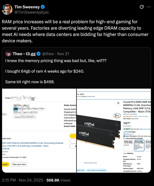 Tim Sweeney: "RAM-Preiserhöhungen werden für High-End-Gaming über Jahre hinweg ein echtes Problem bleiben. Fabriken leiten Kapazitäten für Spitzen-DRAM um, um den KI-Bedarf zu decken, wo Rechenzentren weit höhere Gebote abgeben als die Hersteller von Consumer-Geräten."
