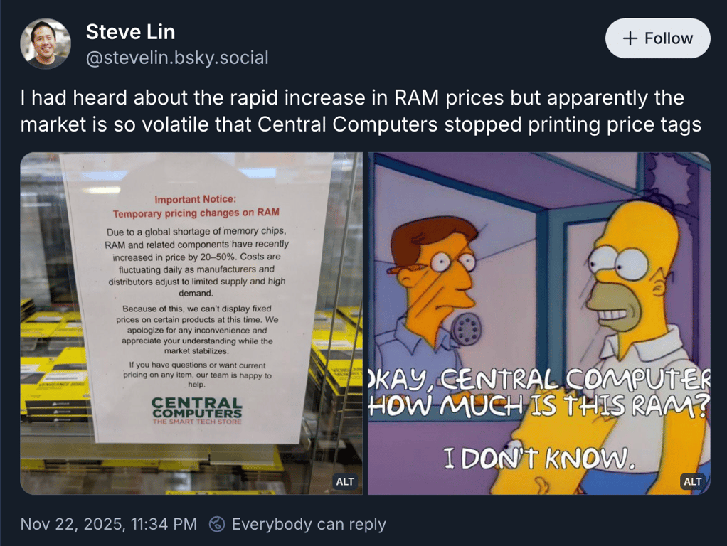 - Tagespreise im Laden: Shops wie Micro Center entfernen Preisschilder, weil die RAM-Kosten stündlich schwanken – wie bei Hummer im Restaurant.